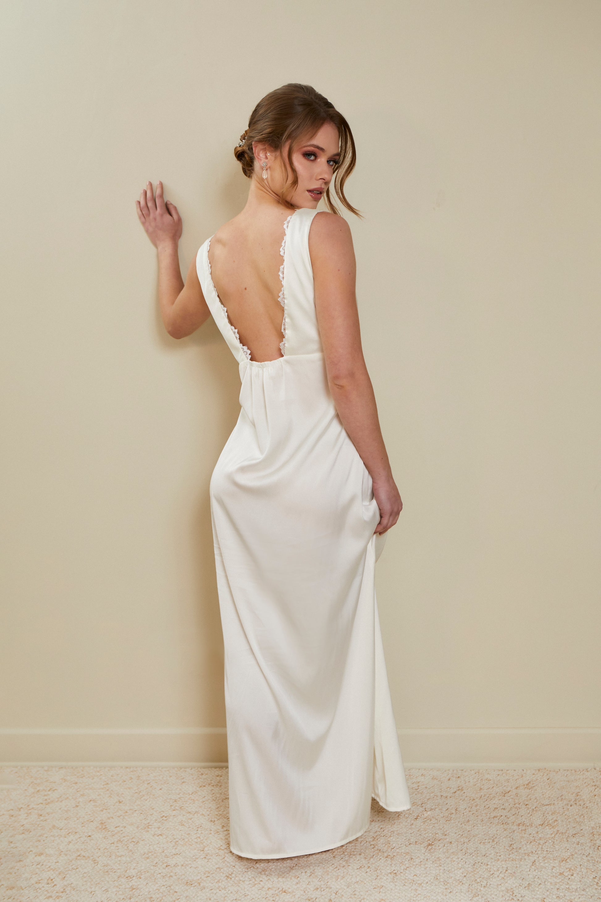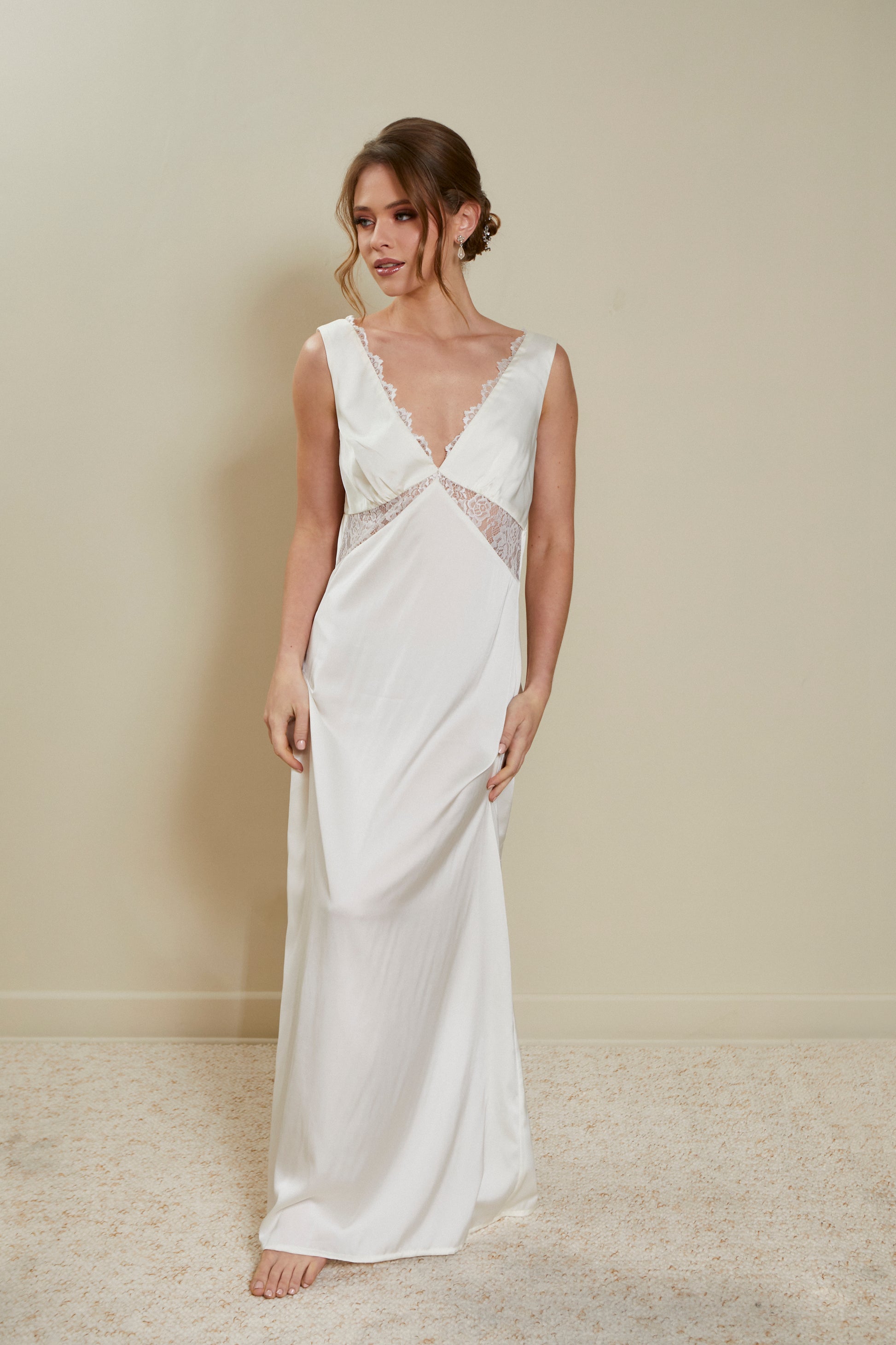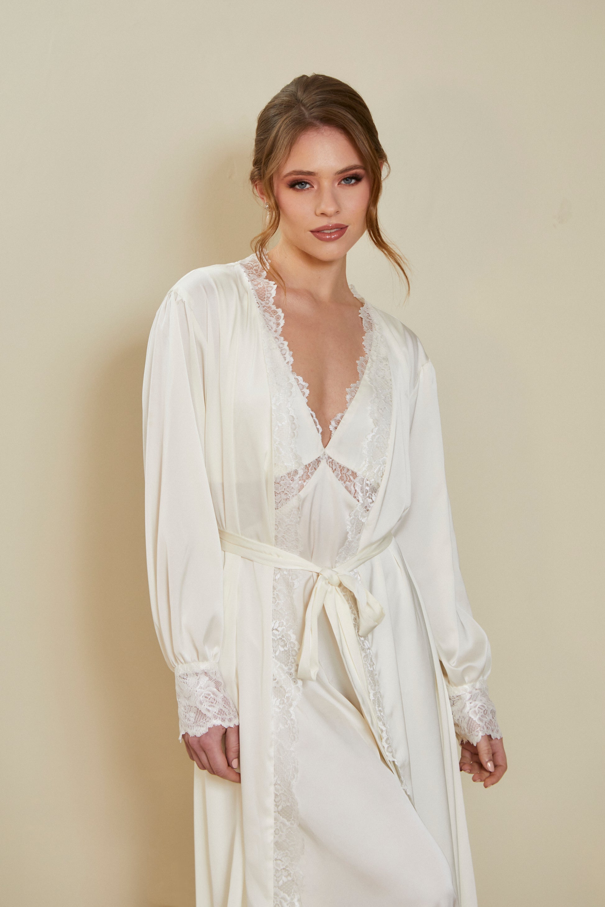 Hecha de seda y un delicado encaje. Tiene un forro interno en el busto para que te la puedas poner sin brassier. Incluye el camisón.