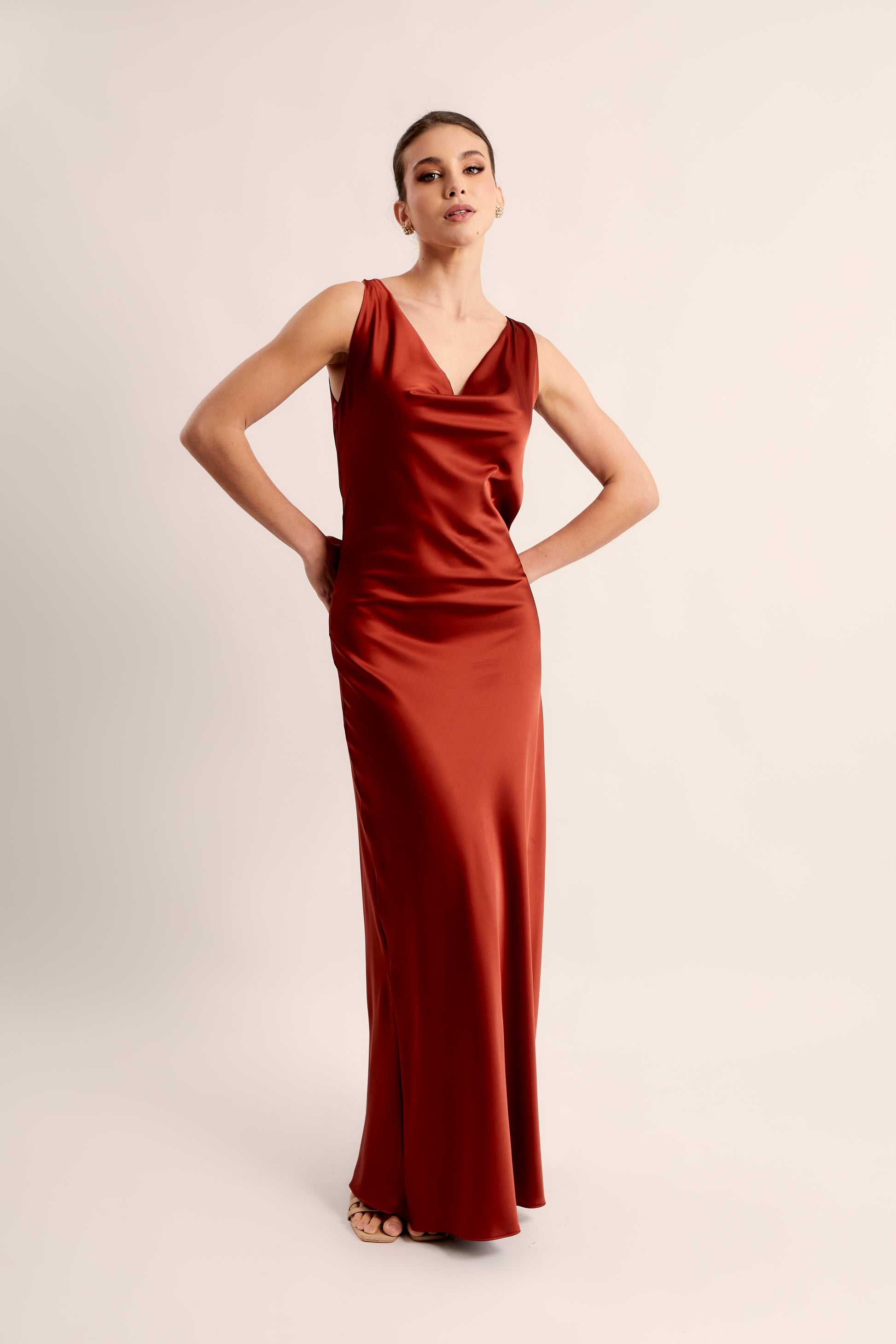 - Vestido de seda con caída en escote delantero y de espalda y abertura lateral